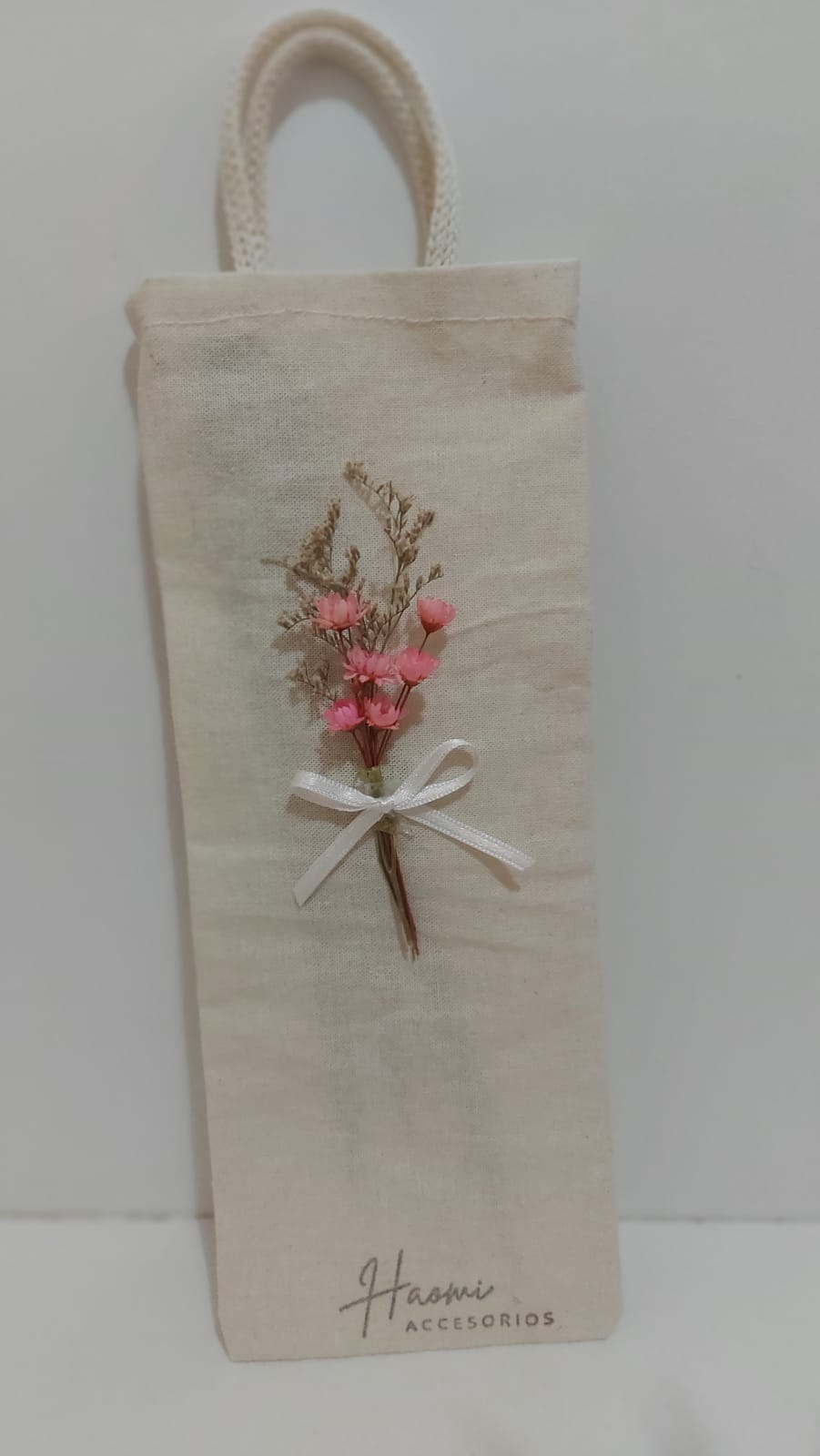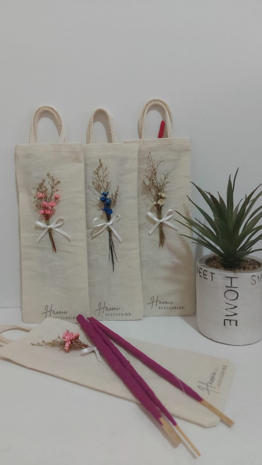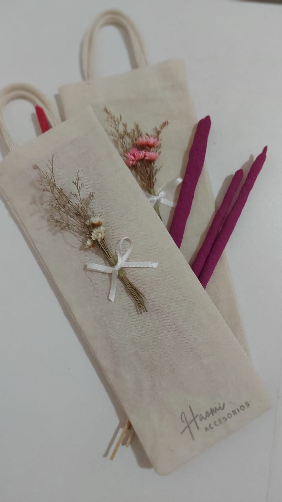 Bolsitas confeccionadas en lienzo con un bouquet de flores para una presentación super delicada para que puedas guardar / ordenar tus sahumerios